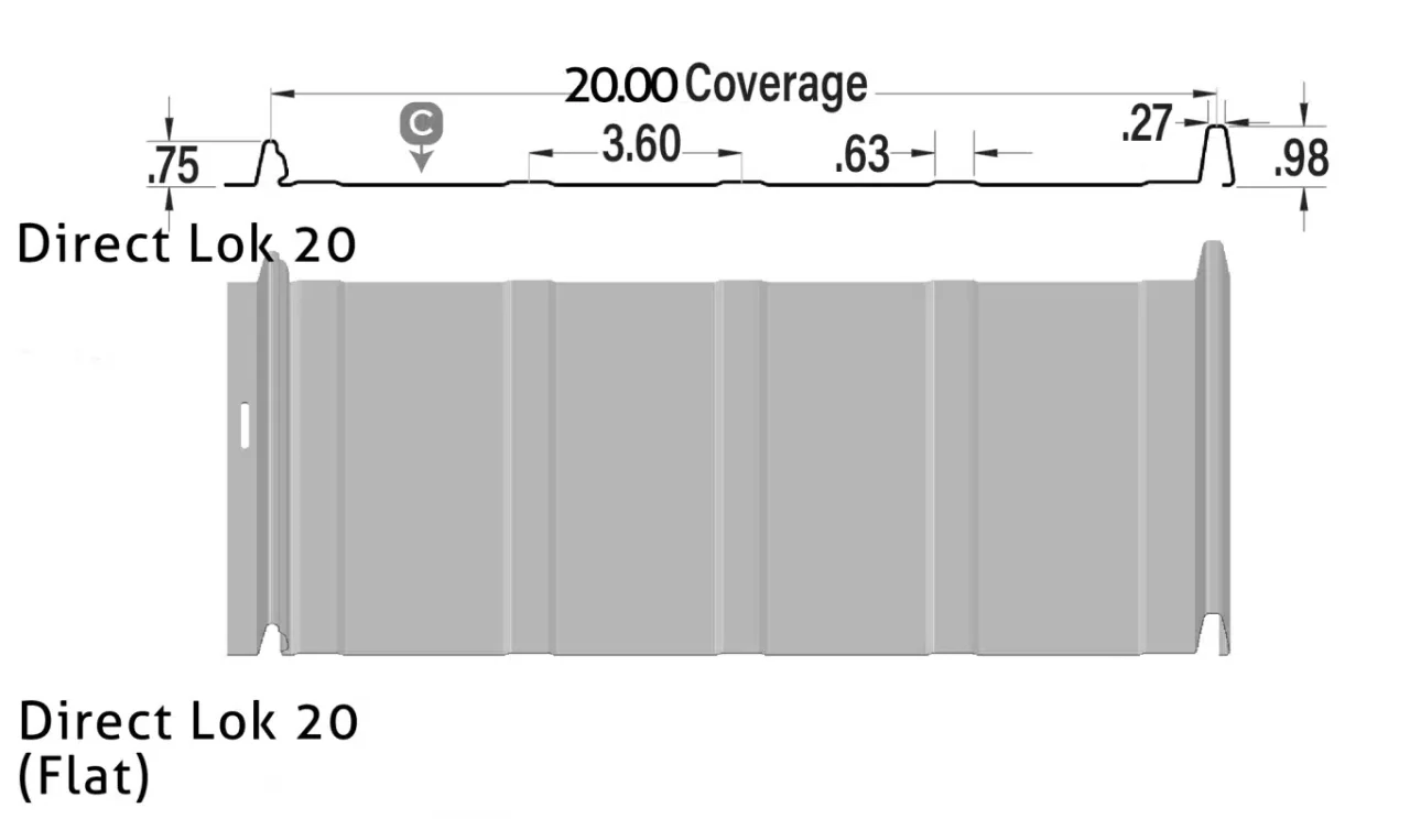 Direct Lok 20″ with a concealed fastening system. The Direct-lok panel with its 20-inch widths and 1″ high rib shows great shadow lines that enhance a board and batten appearance for a wall application. Direct-lok is the preferred profile for contractors as its 20″ width makes for easy handling, cutting and installing.